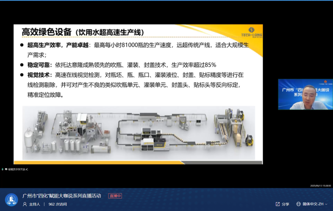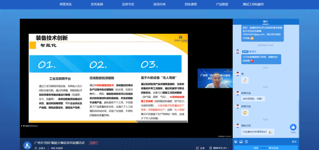 2025年6月19日,在广州市工业和信息化局的精心指导下,广州市“四化”赋能大咖说系列直播第二期圆满举办。本次活动聚焦制造业数字化、网络化、智能化、绿色化转型路径探索,作为行业转型标杆企业,达意隆(002209)受市工信局邀请,由公司监事、企划部副总监兼高级工程师梁殿胜代表出席,围绕包装装备与食品行业实战经验,介绍并分享数字化智能化经验,与行业同仁共话“四化”转型新未来。